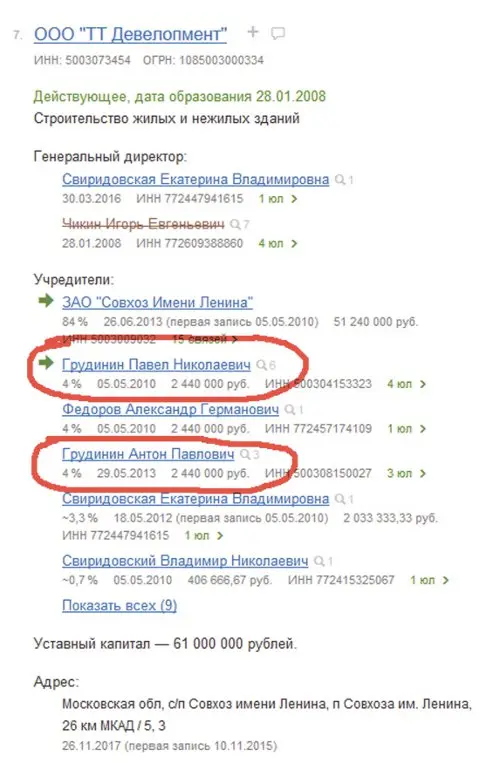 Кстати, ООО «ТТ Девелопмент» ещё можно назвать «Товариществом «Борисовские Пруды», потому что в основе этой фирмы лежат старые дружеские отношения Павла Грудинина, Александра Фёдорова и Николая Свиридовского, которые знают друг друга ещё с начала 1990-х годов. Фёдоров и Свиридовский на заре своей совхозной бизнес-деятельности жили в одном доме в Братеево, на улице Борисовские Пруды. В итоге в этой фирме-«боковичке» собрались друзья и их родственники: Павел Николаевич Грудинин (4% долей ООО), его сын Антон (4%), его друг и заместитель по совхозу Александр Германович Фёдоров (4%), здесь же устроены сын Николая Николаевича Свиридовского Владимир (примерно 0,7%) и его жена Свиридовская Екатерина Владимировна (примерно 3,3%), которая стала гендиректором «Девелопмента». Кстати, это та самая Свиридовская, которая параллельно трудится топ-менеджером в совхозе и получает ежемесячную зарплату 397 тысяч рублей.