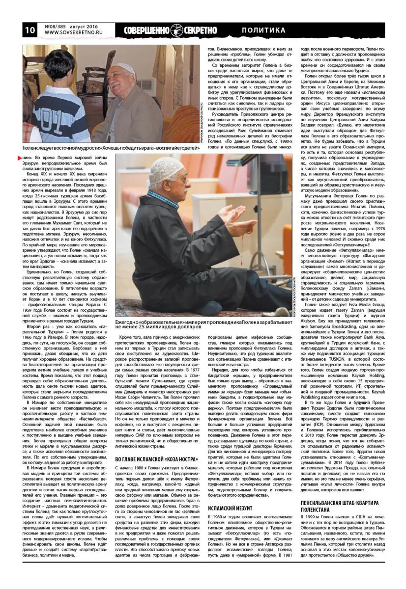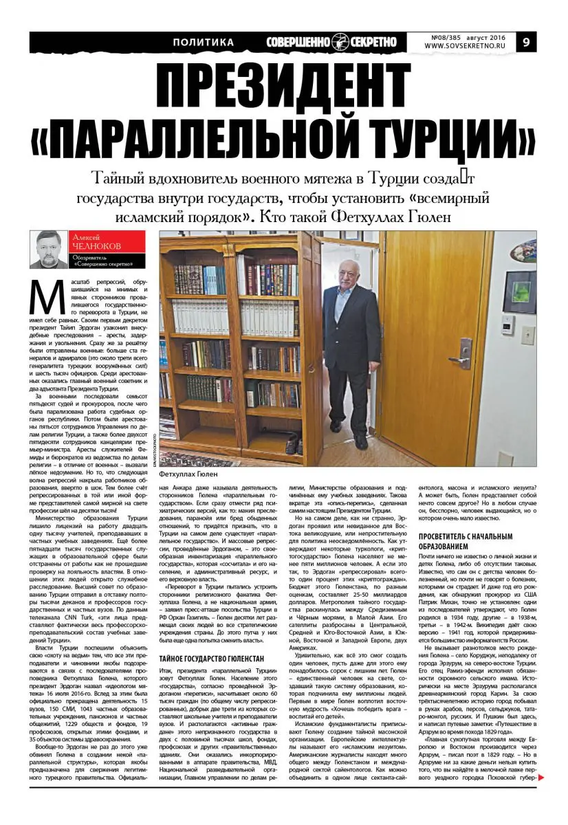 «Переворот в Турции пытались устроить сторонники религиозного фанатика Фетхуллаха Гюлена, а не национальная армия, – заявил пресс-атташе посольства Турции в РФ Орхан Газигиль. – Гюлен десятки лет размещал своих людей во все стратегические учреждения страны. До этого путча у них была еще одна попытка сменить власть».