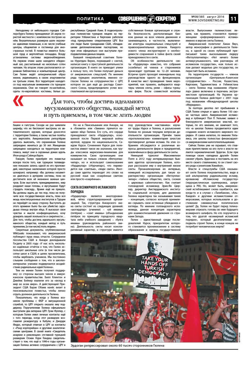 Власти и спецслужбы США оказывают секте Гюлена покровительство, видя в ней альтернативу радикальному исламу, кровавому «Исламскому государству» (террористическая группировка, запрещена в РФ). Но, может быть, американский истеблишмент снова ошибается, как когда-то и в случае с «Талибаном», «Аль-Каидой» и другими исламистскими отморозками, которых использовали в достижении сиюминутных политических целей? Да, Гюлен не будет перед телекамерами отрезать головы во имя будущего всемирного халифата. Но кто поручится в том, что другой «всемирный исламский порядок», который десятилетиями исподволь строит Гюлен, в конце концов не потребует человеческих жертв?