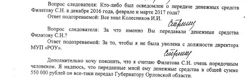 В декабре 2016 года, будучи «в панике» Стрелец отправилась к заместителю Потомского Сергею Филатову, главному специалисту по «инвестициям», чтобы просить его о заступничестве перед Потомским. Через две недели «последний мне сообщил, что он доложил Губернатору как мог обо мне и тот сказал, чтобы я не переживала». Это явилось для Стрелец сигналом к тому, что теперь можно «работать с Филатовым». «После этого, — говорит Стрелец, — я приняла решение отблагодарить Филатова С.Н. С этой целью мной и Колесниковым И.И. было принято решение вновь собрать с предпринимателей по той же схеме денежные средства». А далее «королева кладбищ» рассказала, как она договорилась с Филатовым о встрече, то ли направив ему смс-сообщение, то ли по сети WhatsApp, а затем в его кабинете передала вице-губернатору пакет со спиртным и 150 тысячами рублей. В январе 2017 года она снова пришла к Филатову и «пояснила Филатову С.Н., что денежные средства в сумме 150 тысяч рублей, переданные ему, предназначались Губернатору Орловской области». Филатов улыбнулся и сказал ей, что у неё всё будет хорошо». Стрелец, по её словам, так поняла, что подарок принят и деньги дошли до адресата.