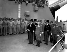 | Японская делегация, прибывшая на борт «Миссури» в сентябре 1945 года подписывать капитуляцию. В первом ряду: министр иностранных дел Сигэмицу Мамору и генерал Умэдзу Ёсидзиро. Оба были пациентами доктора Аксёнова | |