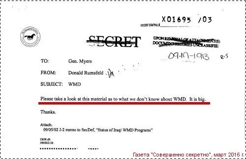 Пятого сентября 2002 года главе Объединённого комитета начальников штабов генералу Ричарду Майерсу доставили совершенно секретный пакет от министра обороны США. Сопроводительная записка от главы Пентагона Дональда Рамсфельда была предельно лаконичной: «Пожалуйста, ознакомься с материалами о том, чего мы не знаем об оружии массового поражения в Ираке. Это и правда очень серьёзно».
