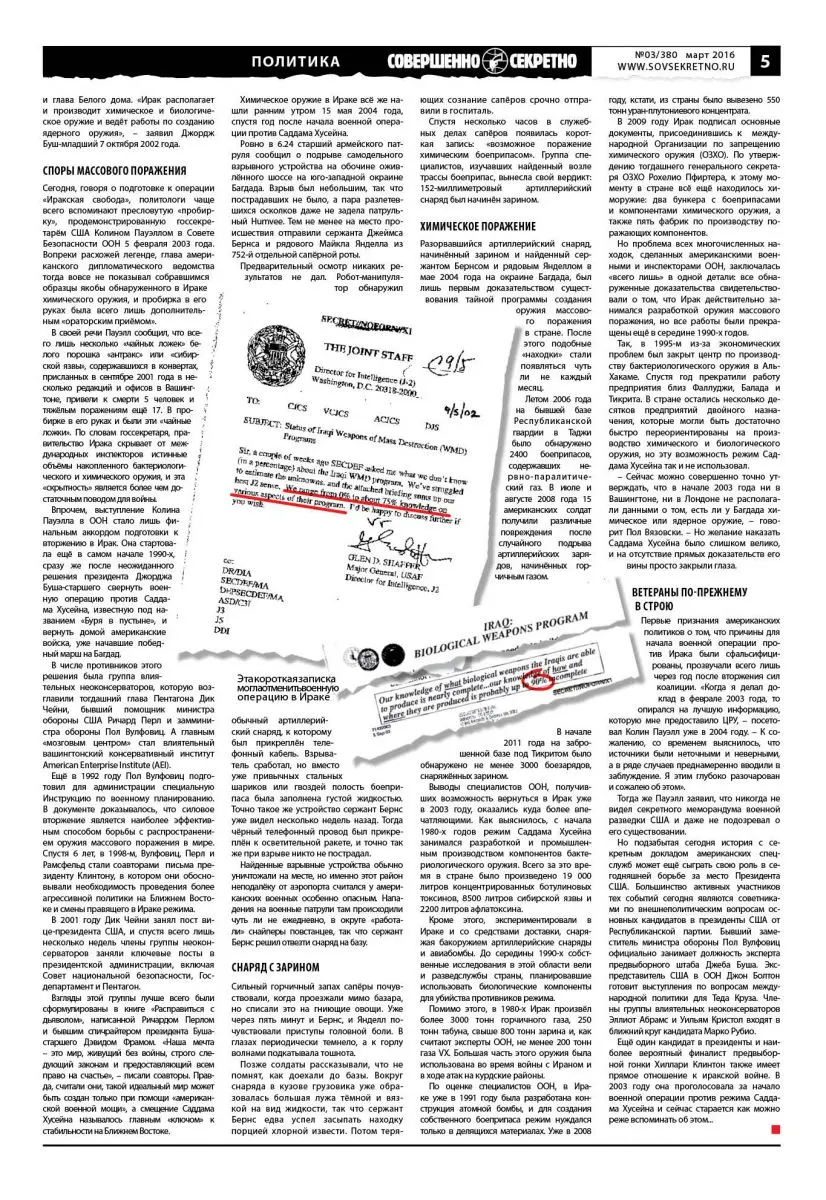 Точно такой же вывод аналитики Пентагона сделали и в отношении программы по созданию химических боеприпасов. «Наши знания об этой программе ограничены сведениями о наличии (в стране) необходимой инфраструктуры. Мы не знаем, сохранилась ли технология производства оружия, и не можем назвать ни одного центра в Ираке, где производились бы готовые химические боеприпасы».