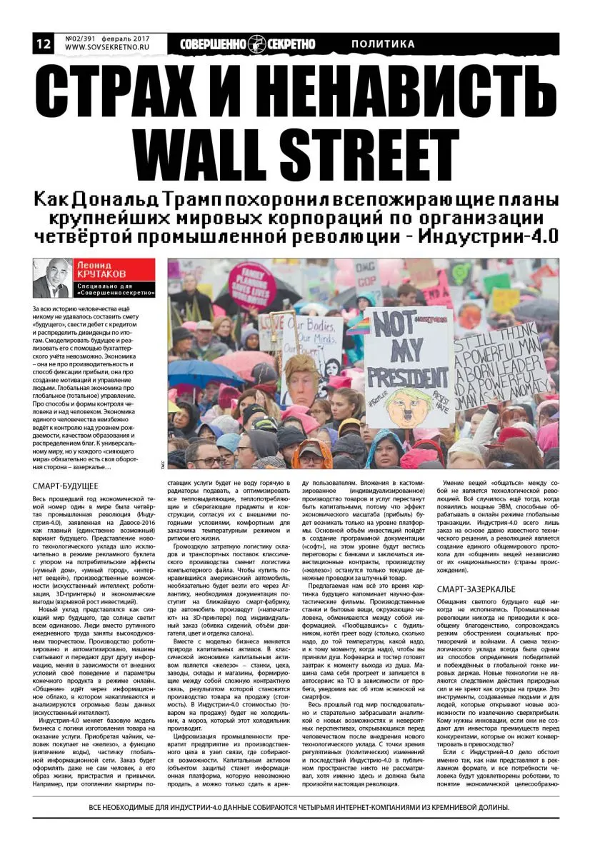 Инаугурационная речь Дональда Трампа действительно была гимном национальной Америке и отходной молитвой глобальному проекту (в том виде, который нам известен) одновременно. Фактически Индустрии-4.0 как единому информационно-технологическому пространству был вынесен приговор. Подписал приговор Трамп, но не он был главным и единственным могильщиком проекта смарт-будущего. Подтверждением этому стал исторический максимум фондового индекса S&P 500, анализирующий крупнейшие мировые компании, и показанный сразу после победы Трампа на выборах.