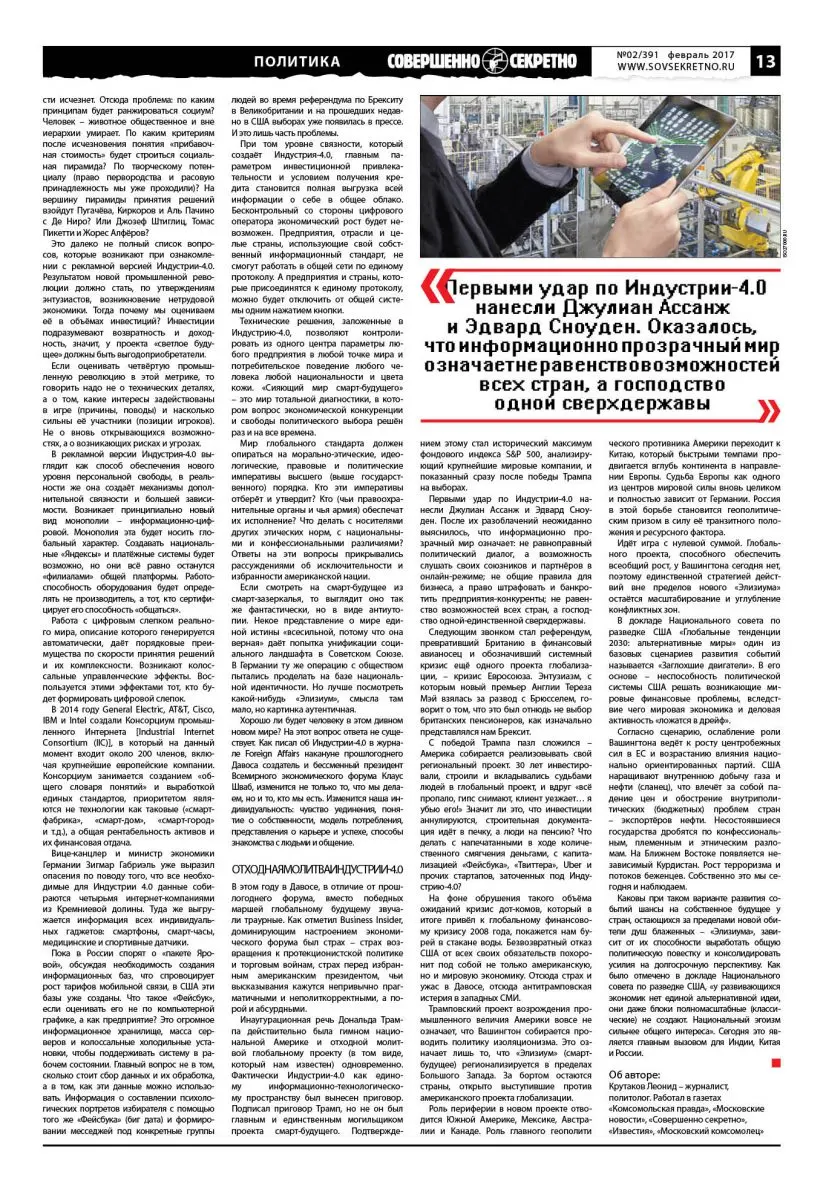 Первыми удар по Индустрии-4.0 нанесли Джулиан Ассанж и Эдвард Сноуден. После их разоблачений неожиданно выяснилось, что информационно прозрачный мир означает: не равноправный политический диалог, а возможность слушать своих союзников и партнёров в онлайн-режиме; не общие правила для бизнеса, а право штрафовать и банкротить предприятия-конкуренты; не равенство возможностей всех стран, а господство одной-единственной сверхдержавы.