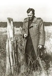 | Александр Твардовский на пепелище родной деревни Загорье в Смоленской области | |