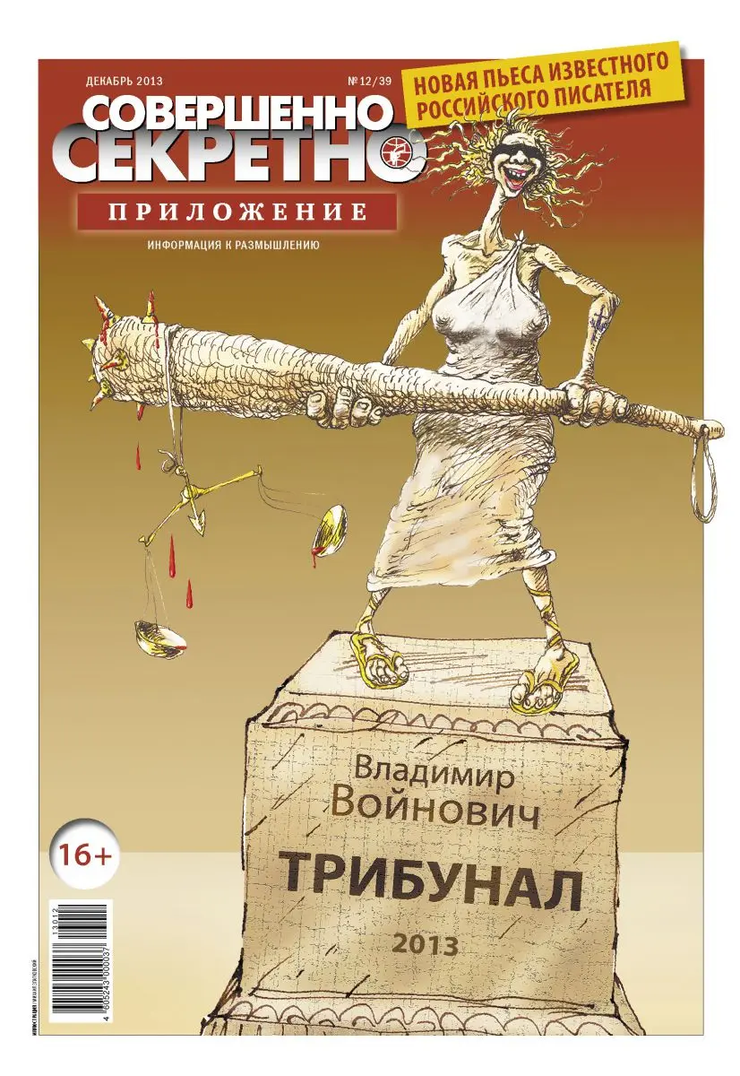 Но пока еще 2013-й – сердечное спасибо Владимиру Николаевичу Войновичу и газете «Совершенно секретно» за потрясающее приложение с комедией «Трибунал». Не пропустите. Это может коснуться всех и каждого.