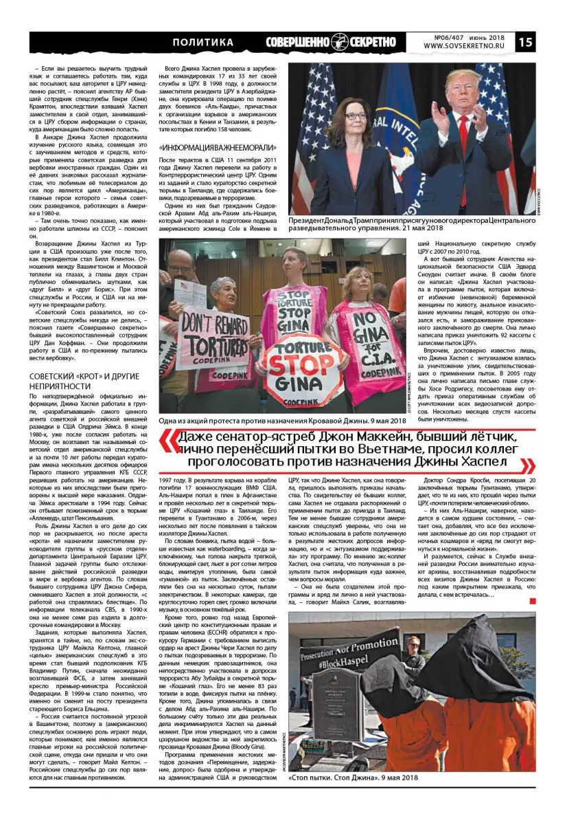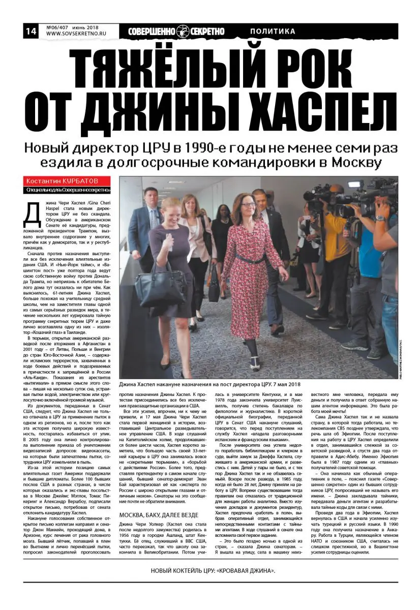 Все эти усилия, впрочем, ни к чему не привели, и 17 мая Джина Чери Хаспел стала первой женщиной в истории, возглавившей Центральное разведывательное управление США. В ходе слушаний на Капитолийском холме, продолжавшихся более шести часов, Хаспел коротко заметила, что большую часть своей 33-летней карьеры в ЦРУ она занималась вовсе не «секретными тюрьмами», а «борьбой с действиями России». Более того, представляя претендентку в самом начале слушаний, бывший сенатор-демократ Эван Бай характеризовал её как «эксперта по России с широко открытыми глазами и отличным нюхом». Сенаторы на это сообщение почти не обратили внимания.