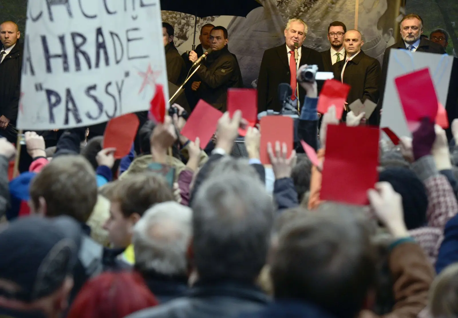 Во время выступления Земана митинг неожиданно превратился в демонстрацию недовольства со стороны пражан: в главу государства полетели помидоры и яйца, толпа свистела, скандировала и показывала красные карточки (как в футболе). Земан не стал прятаться за охрану, а вступил в препирательства с толпой. Однако ни одно яйцо в него не попало, в отличие от Гаука, которому довелось впервые за долгие годы в политике получить яйцом по лбу. Глава Чехии извинился перед Президентом Германии, но своей позиции не изменил: он по-прежнему считает, что Россию нельзя выключать из общемировых политических процессов, например из противостояния с Исламским государством. Кроме того, глава Чехии пригласил Президента России на празднование годовщины освобождения концлагеря Освенцим в январе, что, кстати, могло бы напомнить чехам, что их отношения с Россией начались не сегодня и не в 1968-м, когда Москва приказала ввести в Прагу танки стран Варшавского пакта. Эти заявления сделаны Земаном уже после общественной обструкции. Позиция Гаука после получения яйцом в лоб никак не изменилась.