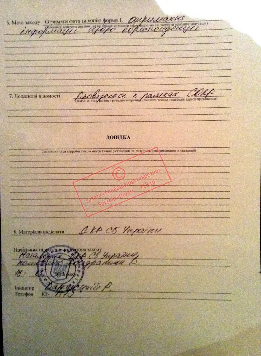 4. Основания для проведения мероприятия: СОКР (дело оперативной разработки. – Ред.) «1624» от 12.04.2014 наличие достаточной информации о разведывательно-подрывной деятельности с/с (спецслужб. – Ред.) иностранных государств, организаций, групп и лиц в отношении Украины