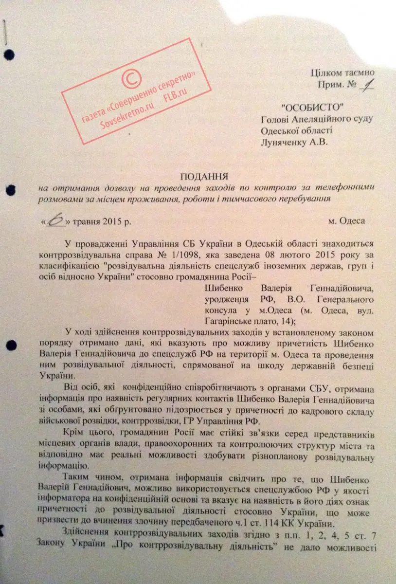 В ходе осуществления контрразведывательных мероприятий в установленном законом порядке получены данные, указывающие на возможную причастность Шибенко Валерия Геннадьевича к спецслужбам РФ, действующим на территории г. Одессы и проведение им разведывательной деятельности, направленной во вред государственной безопасности Украины.