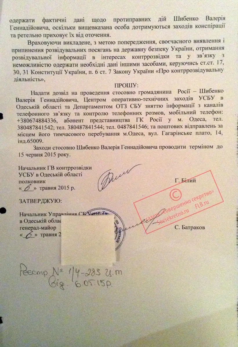 Предоставить разрешение на проведение в отношении гражданина России – Шибенко Валерия Геннадьевича Центром оперативно-технических мероприятий УСБУ по Одесской области и Департаментом ОТС СБУ по снятию информации с каналов телефонной связи и контролю телефонных разговоров, мобильный телефон: +3806748843ХХ (полный номер есть в редакции), абонент представительства ГК России в г. Одессе, тел. 380487841542; тел. 380487841544; тел. 0487841546; и почтовых отправлений по месту его временного пребывания г. Одесса, ул. Гагаринское плато, 14 инд. 65009.