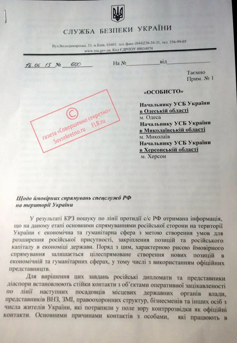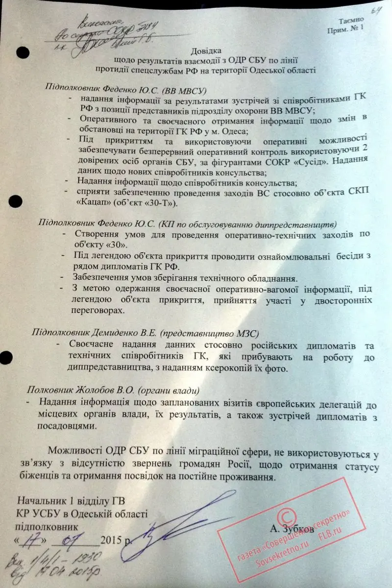 И поэтому с особым удовольствием мы публикуем сегодня копию секретной справки СБУ, которая наверняка поможет российскому генконсульству в Одессе избавиться от назойливых украинских сексотов и эсбэушников под прикрытием.
