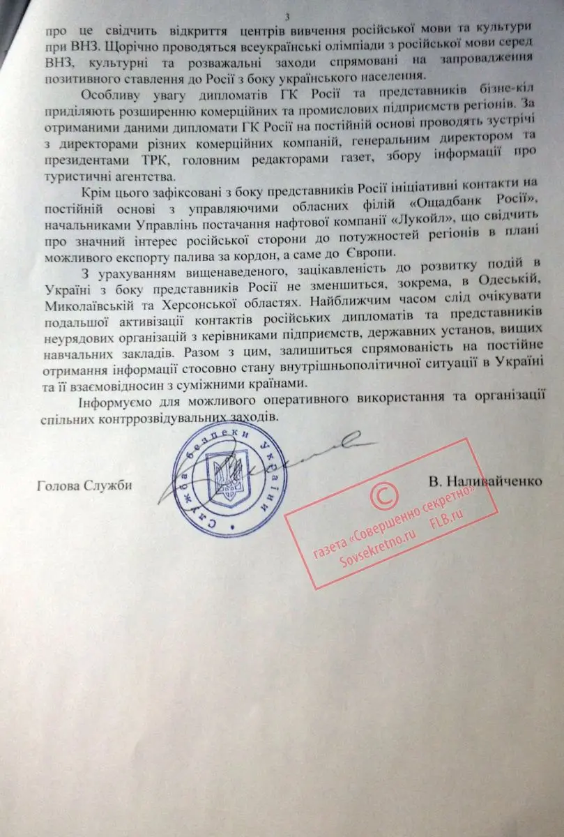 Имеющиеся материалы свидетельствуют об активизации деятельности российской стороны по гуманитарному и религиозному каналам. Россияне активно применяют приёмы популяризации своей культуры и языка в странах своих стратегических интересов, включая Украину. В гг. Одессе, Николаеве, Херсоне об этом свидетельствует открытие центров изучения русского языка и культуры при вузах. Ежегодно проводятся всеукраинские олимпиады по русскому языку среди вузов, культурные и развлекательные мероприятия, направленные на внедрение положительного отношения к России со стороны украинского населения», – писал в своём директивном письме глава украинской тайной полиции.