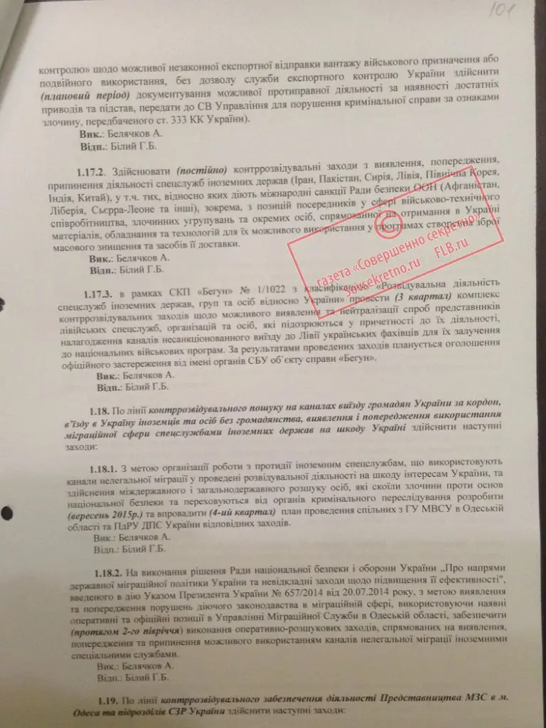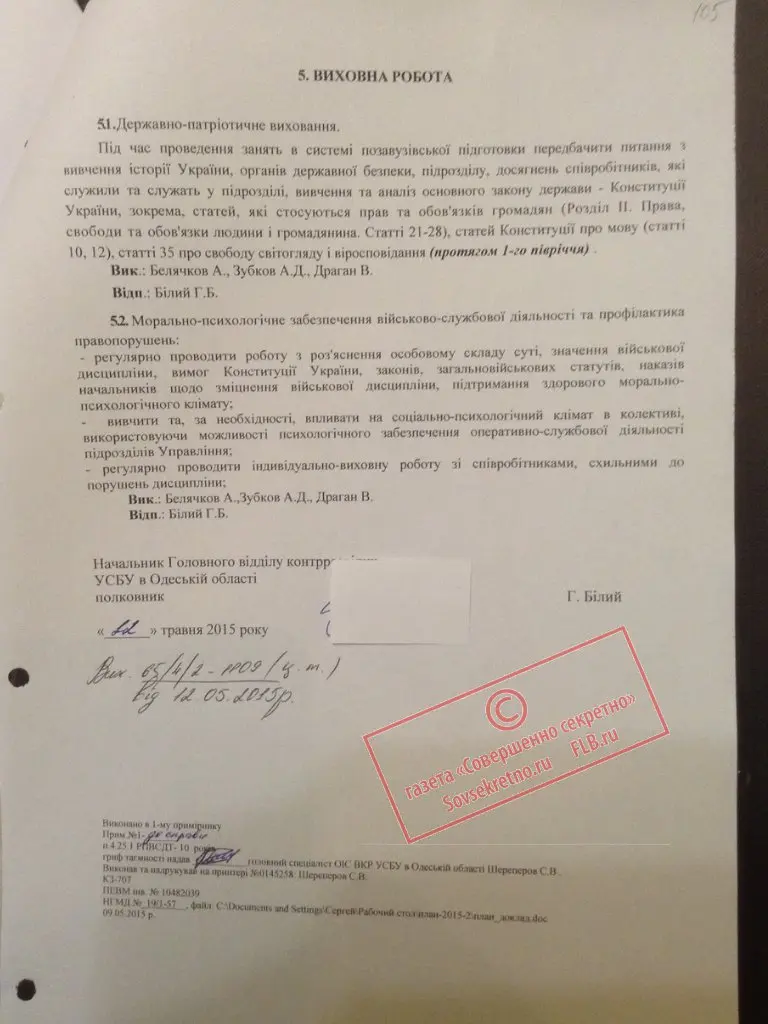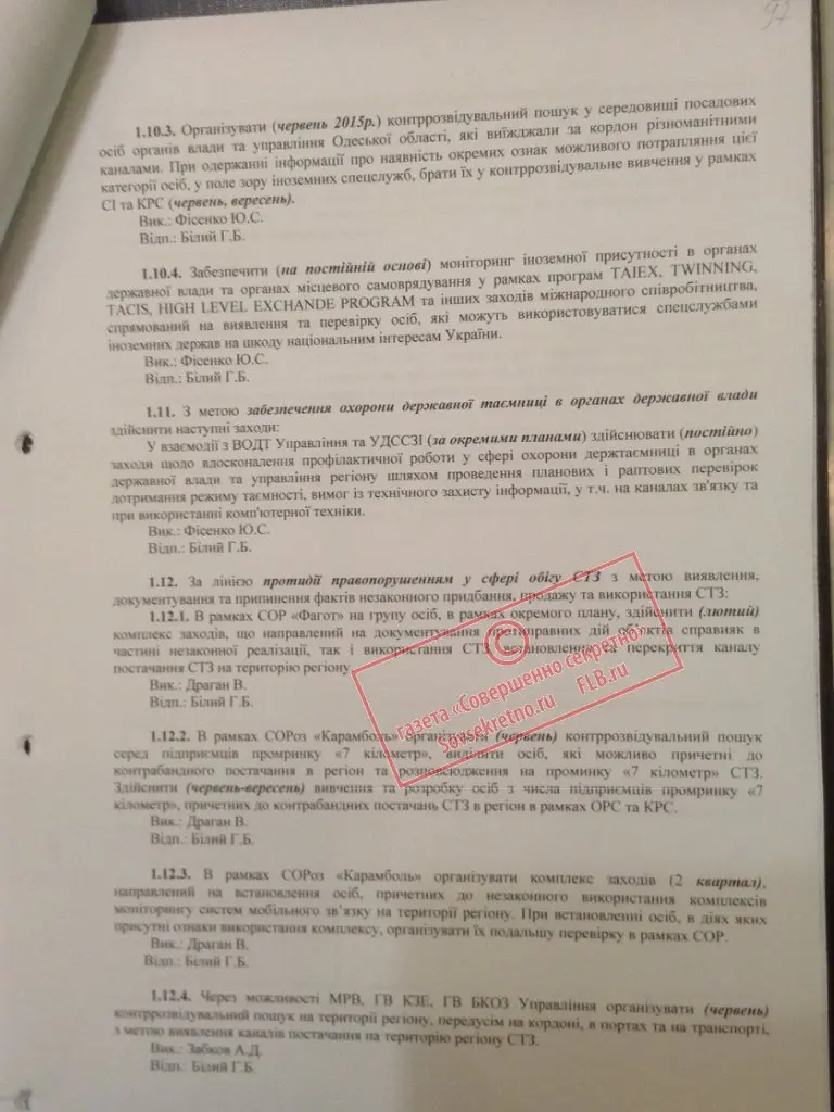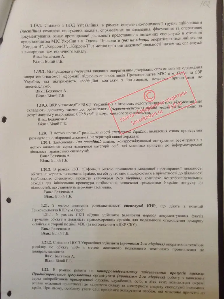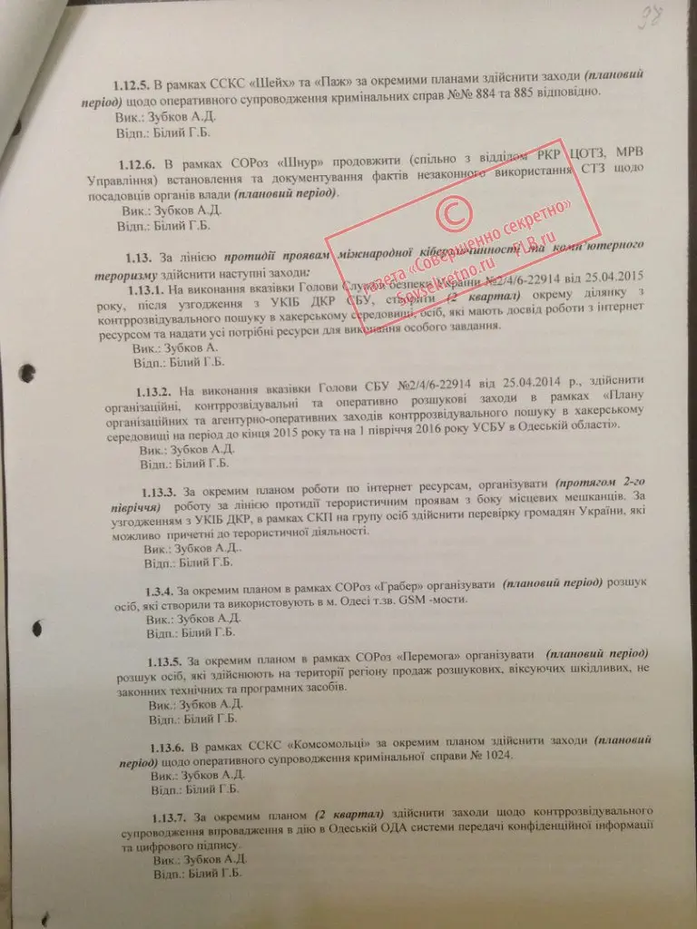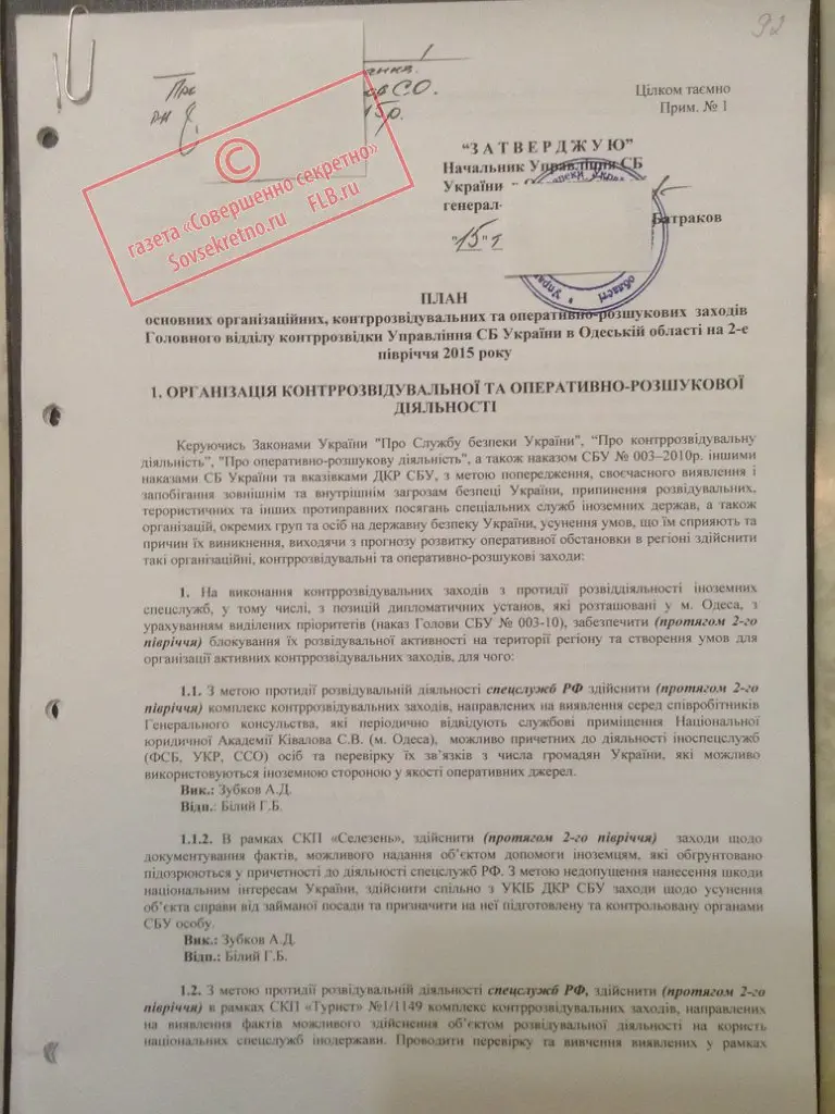 Ещё раз повторим, нас не удивляют недружественные действия СБУ против российских дипломатов. Киевская власть живёт в парадигме «во всех бедах Украины виновата Россия» – так проще скрывать от украинского народа свои грехи идиотизма и мздоимства. Но вот агрессивная охота за дипломатами стран Евросоюза и других государств нас впечатлила. Причём это не случайные проявления враждебности. Свои преступные оперативные мероприятия «по документированию» дипломатических работников они планируют загодя – на полгода-год вперёд. Это доказывает, например, секретный «План основных организационных, контрразведывательных и оперативно-розыскных мероприятий Главного отдела контрразведки Управления СБ Украины по Одесской области на 2-е полугодие 2015 года». (Совершенно секретно, экз. 1). Это подробный 14-страничный документ, утверждённый уже знакомым нам начальником Управления СБ Украины по Одесской области генерал-майором Сергеем Батраковым. А составил план 22 мая 2015 года всё тот же начальник одесской контрразведки Г.Б. Белый