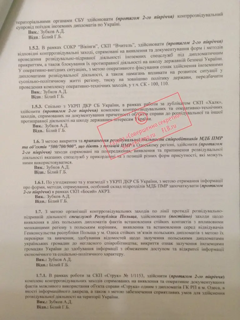 1.7. С целью организации контрразведывательных мероприятий по линии противодействия разведывательно-подрывной деятельности спецслужб Республики Польша осуществлять (постоянно) мероприятия по выявлению в действиях польских дипломатов фактов установления устойчивых контактов с влиятельными жителями региона, имеющими польские корни, выявлению и установлению среди посетителей Генконсульства республики Польша в г. Одессе устойчивых связей с польскими дипломатами, с целью их проверки и изучения; получение сведений по привлечению польскими дипломатами граждан Украины для негласного сотрудничества, разоблачения признаков вовлечения иностранцами украинских граждан для добывания информации ограниченного доступа и открытой информации экономического и социально-политического характера.