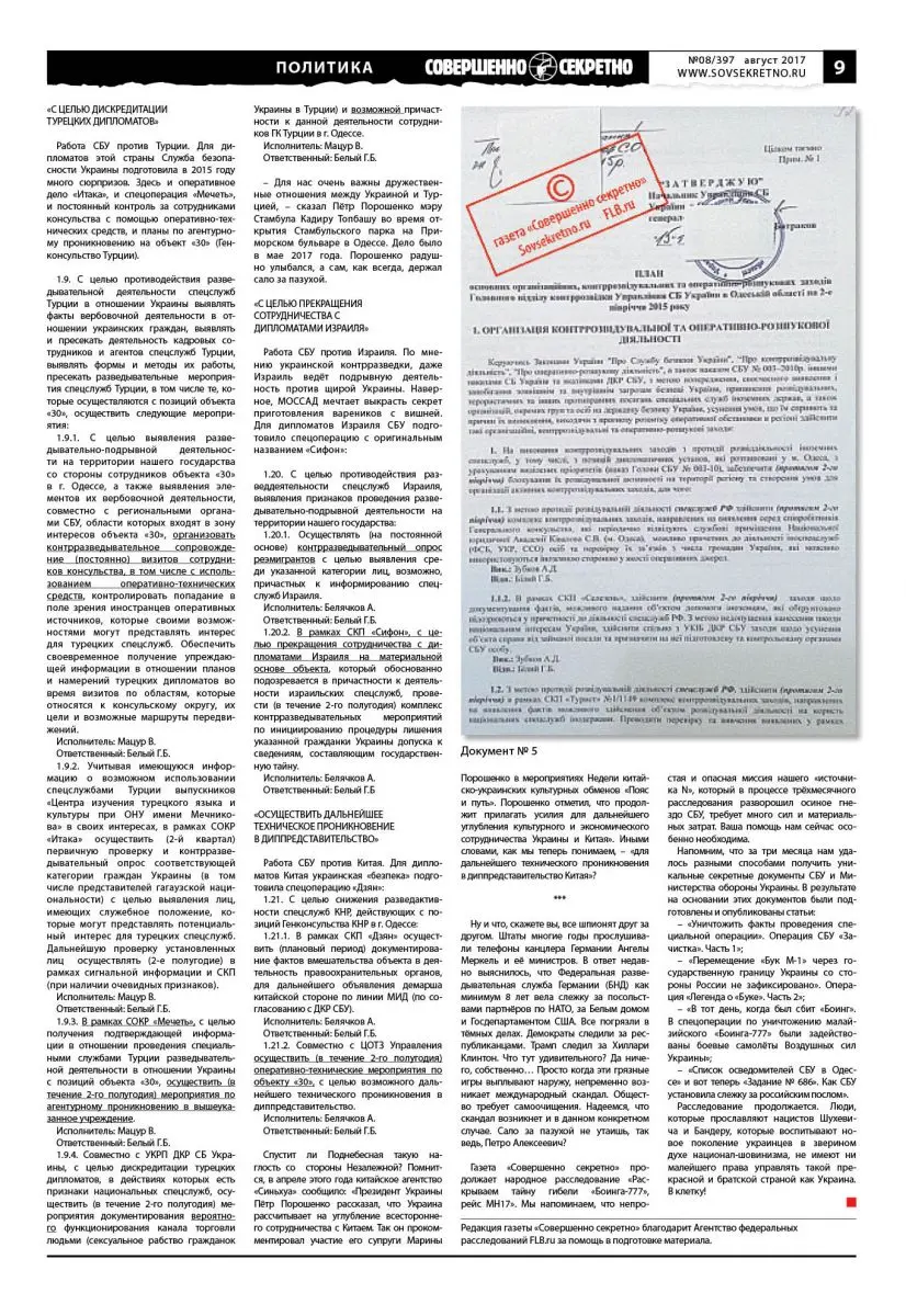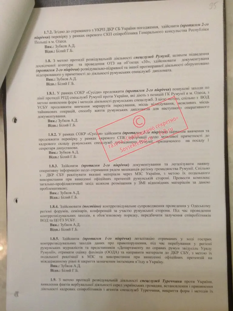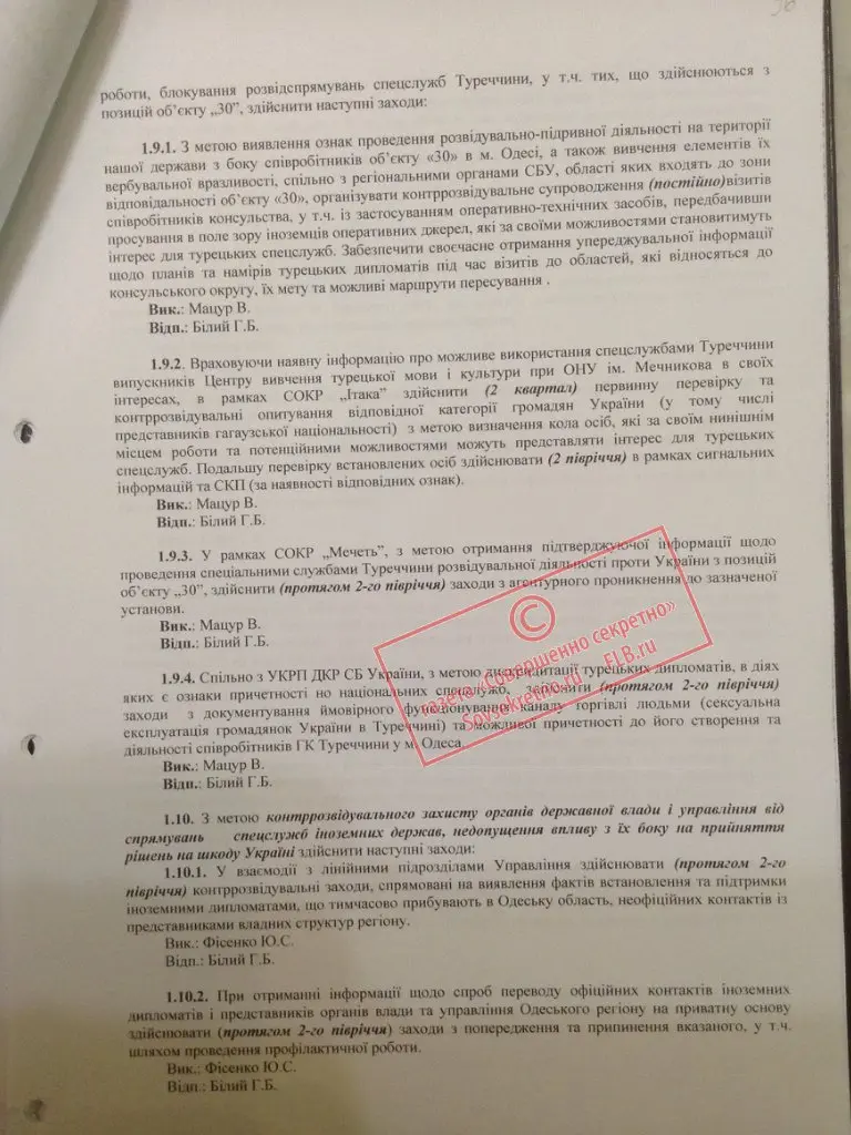 1.9.4. Совместно с УКРП ДКР СБ Украины, с целью дискредитации турецких дипломатов, в действиях которых есть признаки национальных спецслужб, осуществить (в течение 2-го полугодия) мероприятия документирования вероятного функционирования канала торговли людьми (сексуальное рабство гражданок Украины в Турции) и возможной причастности к данной деятельности сотрудников ГК Турции в г. Одессе.