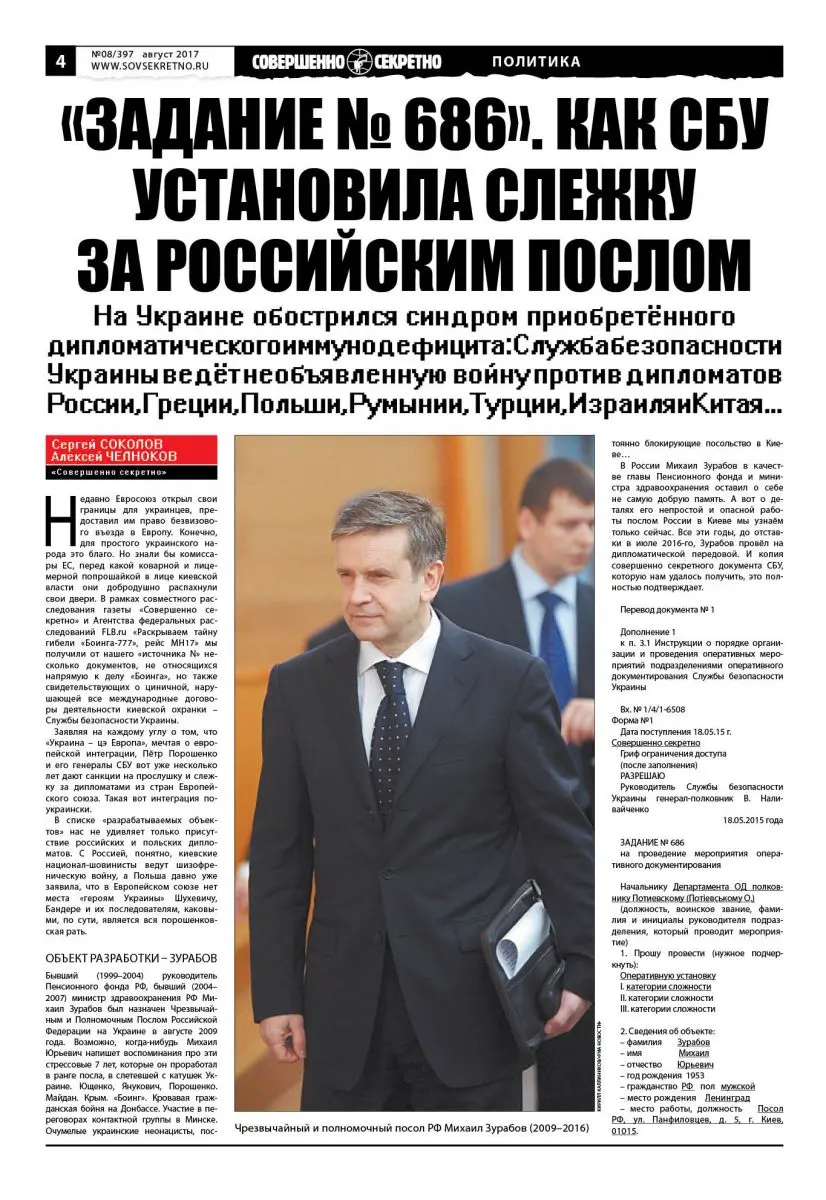 В России Михаил Зурабов в качестве главы Пенсионного фонда и министра здравоохранения оставил о себе не самую добрую память. А вот о деталях его непростой и опасной работы послом России в Киеве мы узнаём только сейчас. Все эти годы, до отставки в июле 2016-го, Зурабов провёл на дипломатической передовой. И копия совершенно секретного документа СБУ, которую нам удалось получить, это полностью подтверждает.
