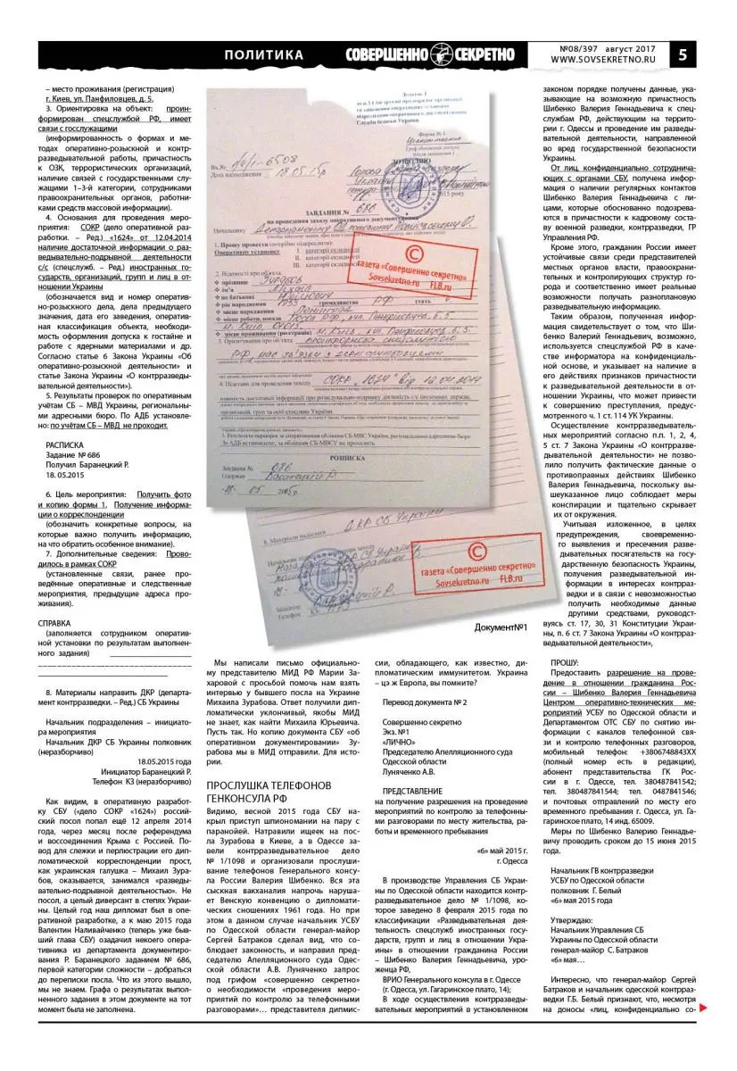Интересно, что генерал-майор Сергей Батраков и начальник одесской контрразведки Г.Б. Белый признают, что, несмотря на доносы «лиц, конфиденциально сотрудничающих с органами СБУ», они не располагают «фактическими данными о противоправных действиях Шибенко», а чтобы обнаружить таковые, им необходимо организовать прослушку. Вот и получается замкнутый круг безысходной некомпетентности: контрразведывательное дело заведено, а компромата нет, и приходится генералу с полковником нарушать международное право. А что делать – вынуждены выполнять приказы киевского руководства, заболевшего маниакально-русофобским синдромом