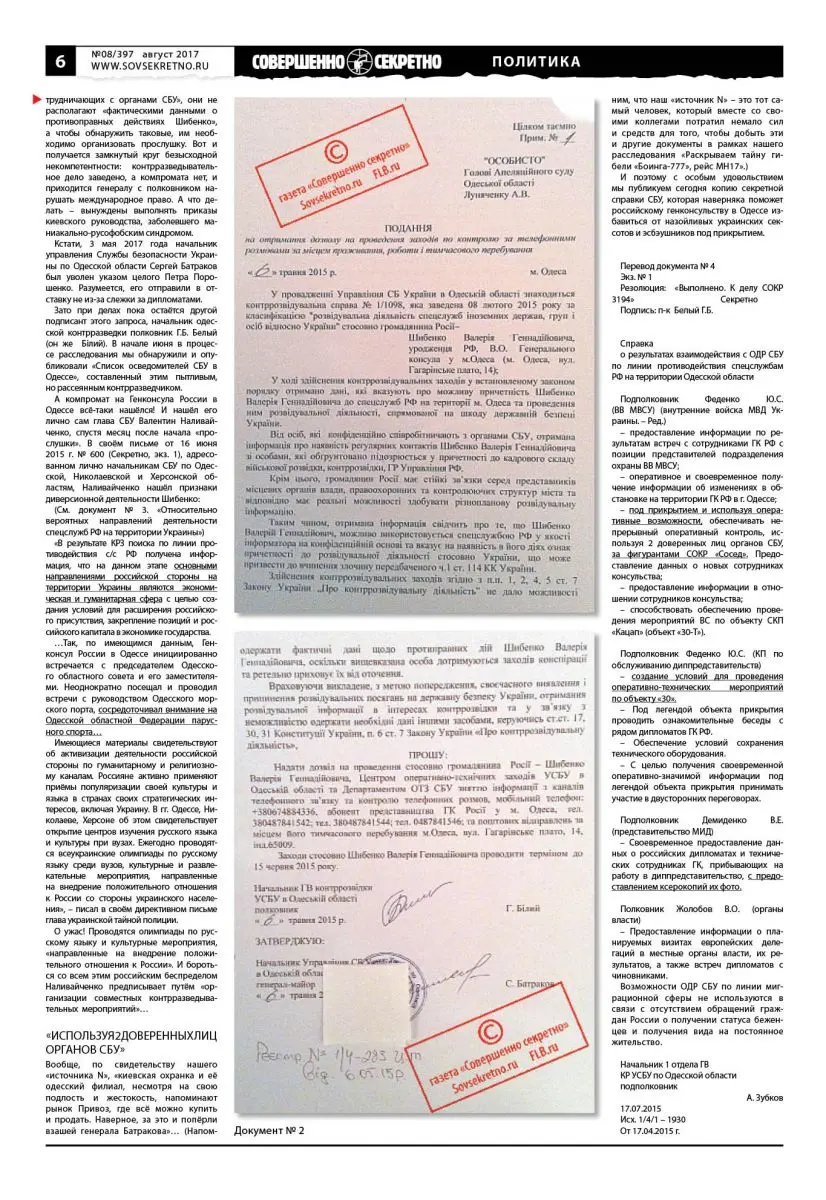 А компромат на Генконсула России в Одессе всё-таки нашёлся! И нашёл его лично сам глава СБУ Валентин Наливайченко, спустя месяц после начала «прослушки». В своём письме от 16 июня 2015 г. № 600 (Секретно, экз. 1), адресованном лично начальникам СБУ по Одесской, Николаевской и Херсонской областям, Наливайченко нашёл признаки диверсионной деятельности Шибенко: