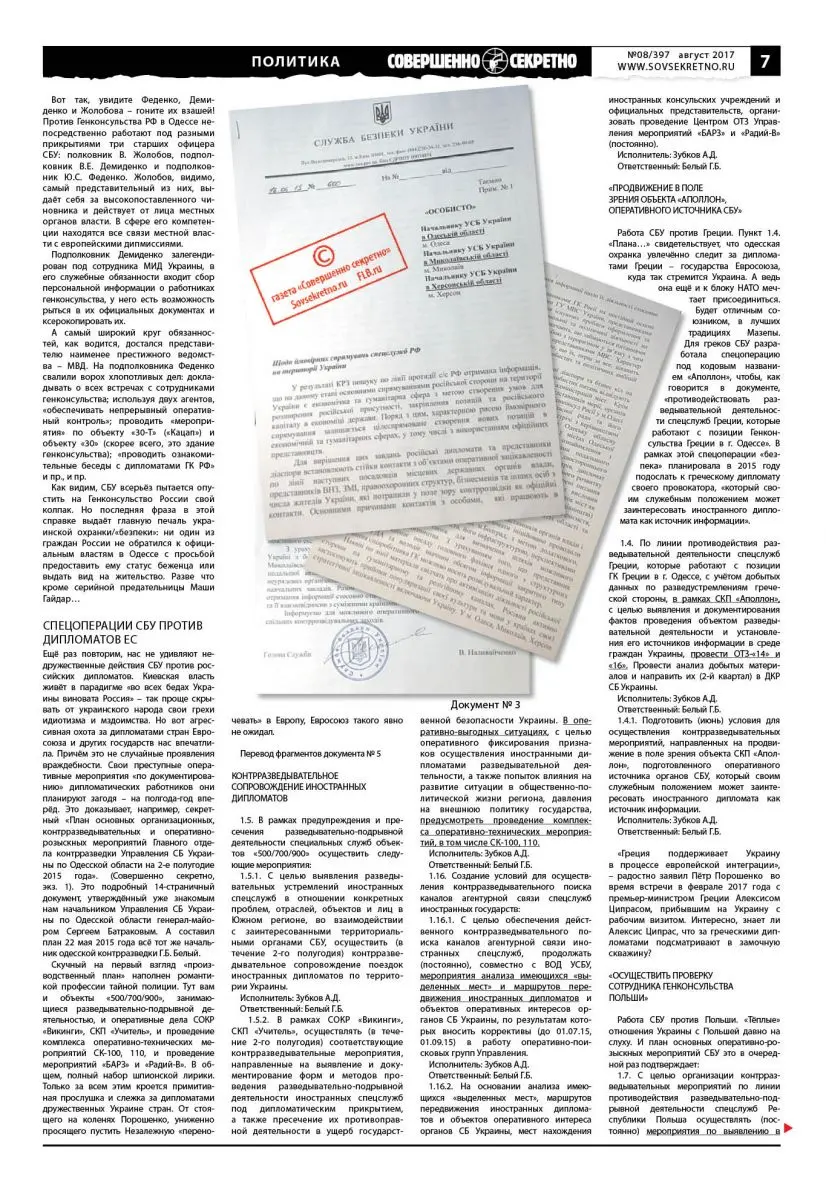 Работа СБУ против Греции. Пункт 1.4. «Плана…» свидетельствует, что одесская охранка увлечённо следит за дипломатами Греции – государства Евросоюза, куда так стремится Украина. А ведь она ещё и к блоку НАТО мечтает присоединиться. Будет отличным союзником, в лучших традициях Мазепы. Для греков СБУ разработала спецоперацию под кодовым названием «Аполлон», чтобы, как говорится в документе, «противодействовать разведывательной деятельности спецслужб Греции, которые работают с позиции Генконсульства Греции в г. Одессе». В рамках этой спецоперации «безпека» планировала в 2015 году подослать к греческому дипломату своего провокатора, «который своим служебным положением может заинтересовать иностранного дипломата как источник информации».