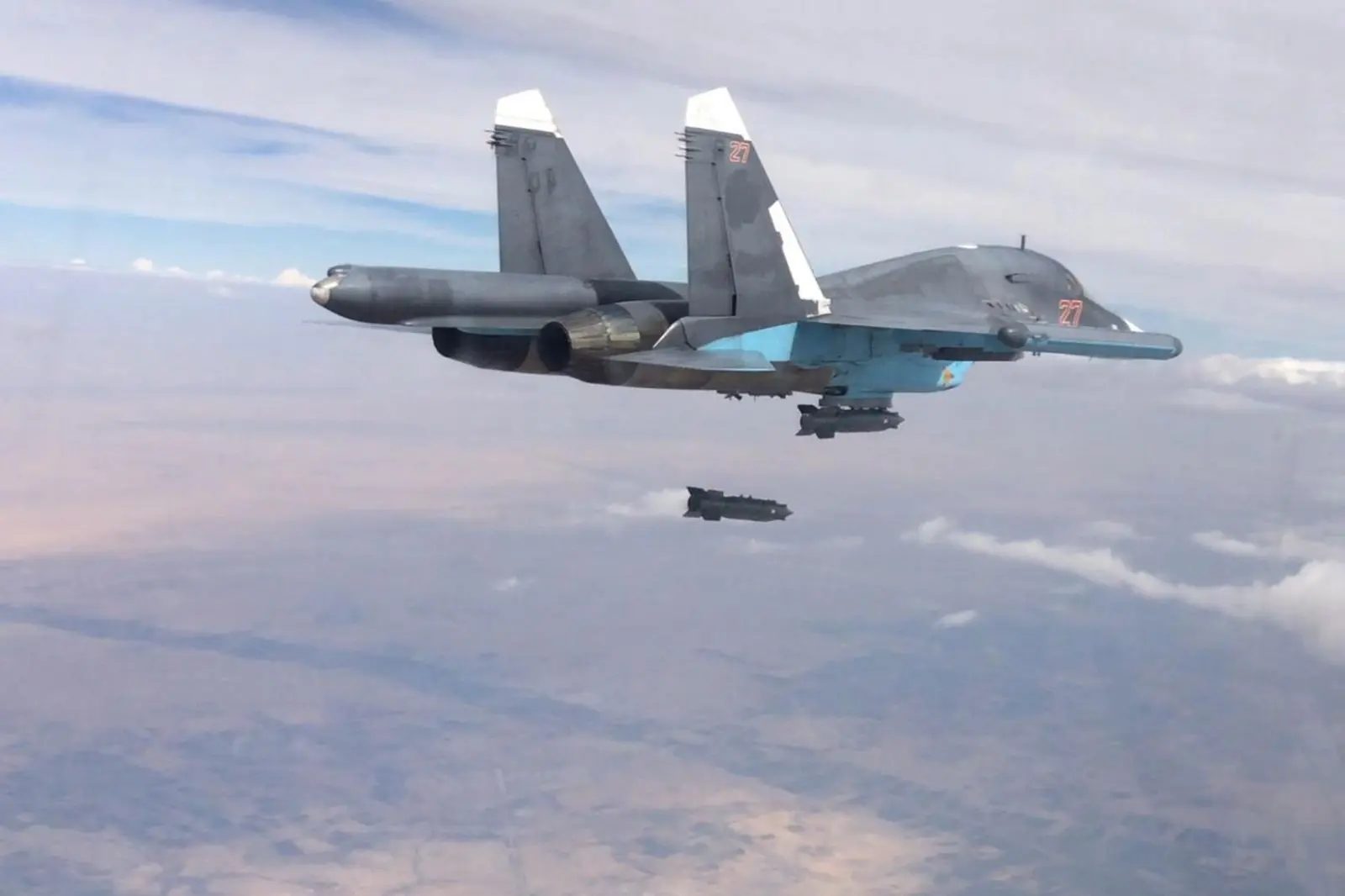 РОССИЙСКИЙ ИСТРЕБИТЕЛЬ-БОМБАРДИРОВЩИК СУ-34 ВО ВРЕМЯ НАНЕСЕНИЯ АВИАЦИОННОГО УДАРА В ПРОВИНЦИИ РАККА, КОТОРАЯ КОНТРОЛИРУЕТСЯ ГРУППИРОВКОЙ ИГ