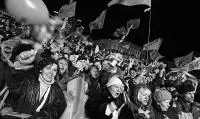 Сторонники оппозиции, после президентских выборов собравшиеся на площади Независимости в Киеве, приветствуют своего лидера Виктора Ющенко |