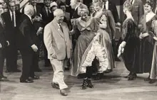 | Никита Хрущев во время посещения Голливуда совершает танцевальное па с американской актрисой Ширли Маклейн | |