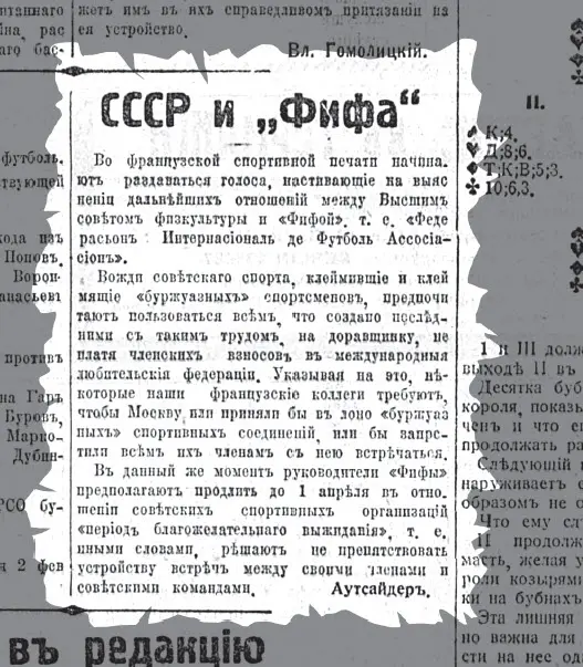 Подобное отношение ФИФА к советскому футболу вызывало раздражение как французской спортивной печати, так и русских эмигрантских кругов. «Вожди советского спорта, клеймившие и клеймившие «буржуазных» спортсменов, предпочитают пользоваться всем, что создано последними с таким трудом, на даровщинку, не платя членских взносов в международные любительские федерации. Указывая на это, некоторые наши французские коллеги требуют, чтобы Москву или приняли бы в лоно «буржуазных» спортивных соединений, или бы запретили всем их членам с нею встречаться», – писала в январе 1936 года парижская газета «Возрождение».