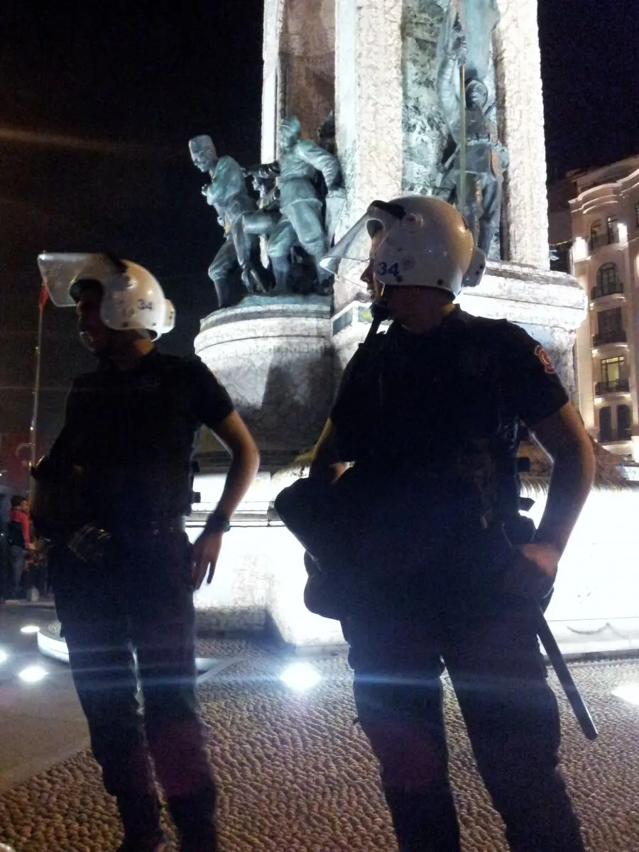 Прямоугольник монумента Ататюрку напоминал музыкальную шкатулку: со стороны памятника доносились звуки рояля («piano», англ.) Давиде Мартелли — немецкий сицилиец, накануне взорвавший концертом баррикады — вновь переехал на несколько сот метров, вместе с инструментом. Три тысячи — в публике. «Люстры» выключились. Полицейские вокруг монумента в какой-то момент вдруг сняли шлемы. Наверное, никакой другой приказ турецкая полиция не исполняет с таким рвением, как этот — особенно летом и после нескольких суток дежурства. Публика — тоже без касок.